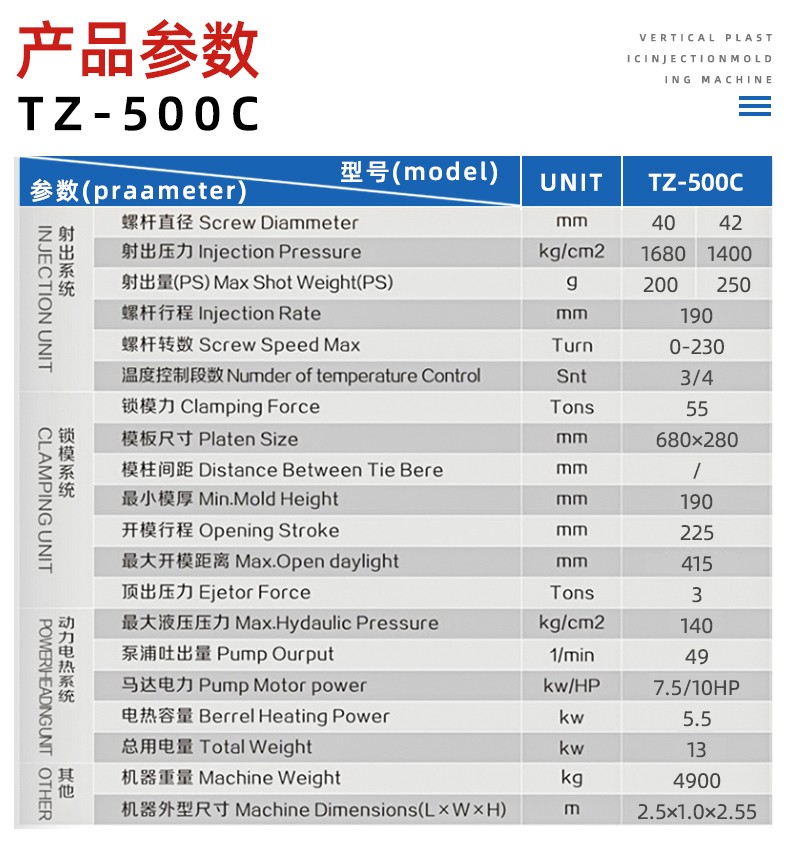 TZ-550C型電源(yuan)連接線專(zhuan)用立式注(zhù)塑機特性(xìng): 1、立式合模(mo),卧式射出(chu),機體結構(gòu)緊湊,射出(chu)有力,适合(hé)大型鑲🤞件(jiàn)🥰成型 2、C型機(jī)體,操作無(wu)柱子妨礙(ai),速度快 3、射(she)台高低,可(kě)上下調整(zhěng) 4、可加裝滑(hua)闆、圓盤、提(tí)高工作效(xiao)率